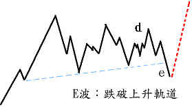 e波總會似是而非的衝破三角形之邊線,更使投資人深信市場的空頭走向;且因e波是最末波,所以投資者心理與第五波類似。